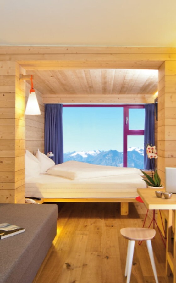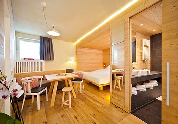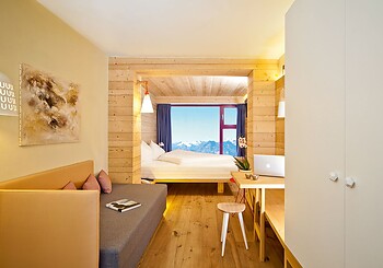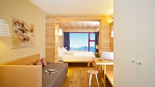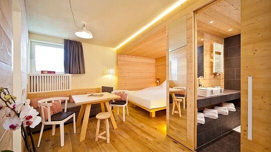 The new room, furnished with spruce wood in alpine style, offers a sensational view directly from the bed. The room faces Maso Corto. When the weather is fine, you can see King Ortler and the surrounding mountains.